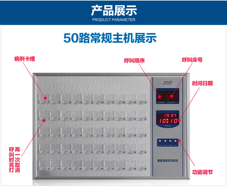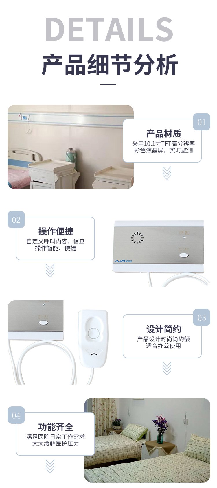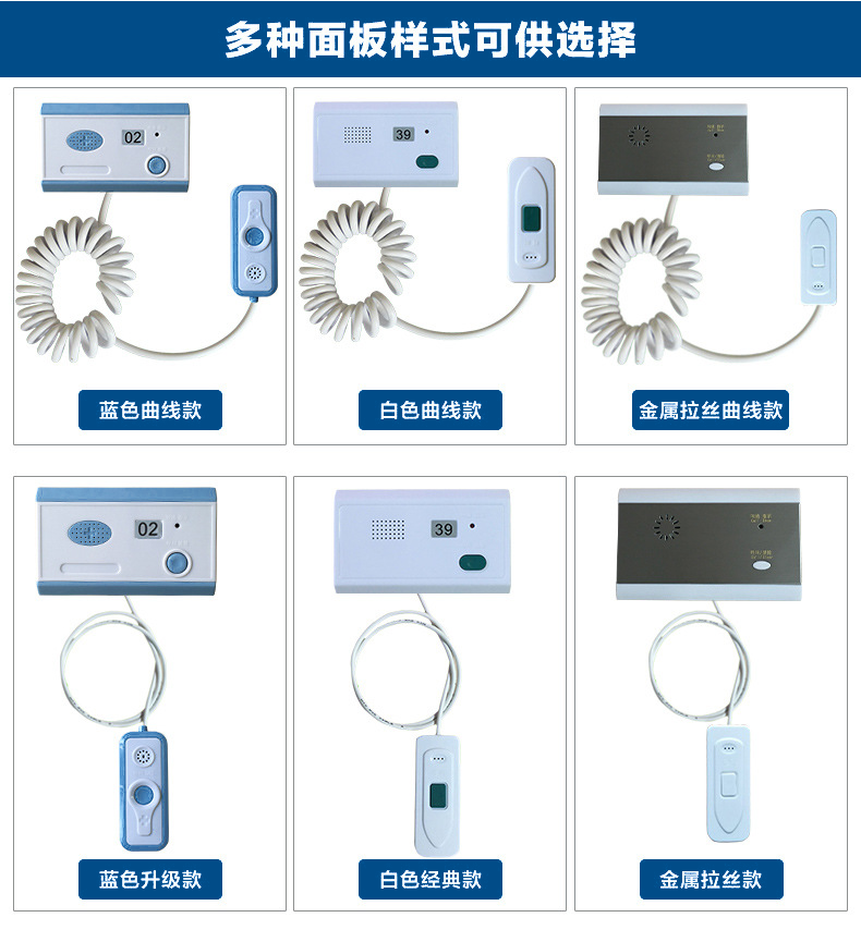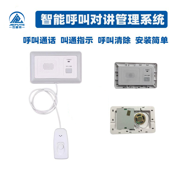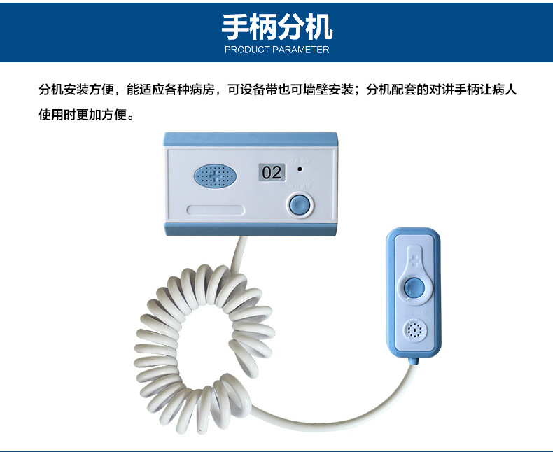 分机由两部分组成:面板与手柄线组成。面板上有“呼叫/取消按钮”及喇叭,手柄线有受话咪头与按钮。从护士站过来的声音由面板上喇叭传出。病人可以在床上按手柄线上的按钮呼叫或面板上的“呼叫/取消”按钮呼叫,服务人员到床前服务后可以按面板上的呼叫按钮再取消呼叫。